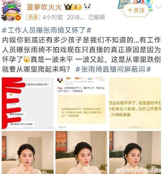 3月19日,网络突传"工作人员爆料张雨绮再度怀孕"引发热议,称其因此暂停拍戏仅专注直播,引发热议!